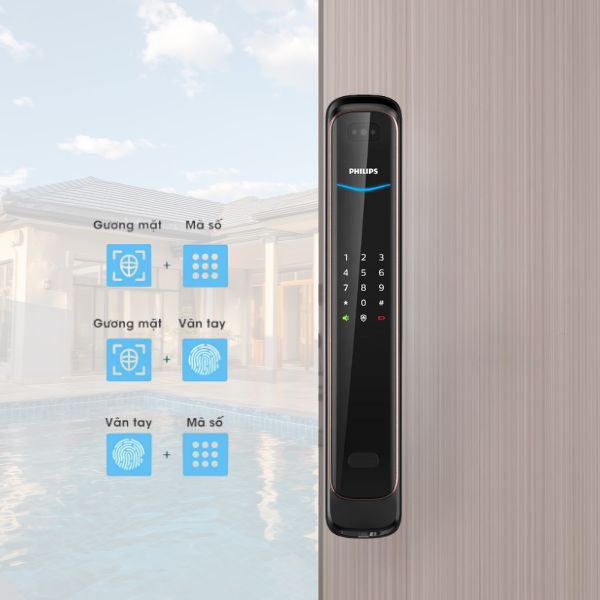 Philips 9300 with Gateway mang thiết kế push–pull sang trọng, thân hợp kim nhôm + kính cường lực, tích hợp 5 phương thức mở khóa: vân tay, mã số, thẻ từ, chìa cơ và App Bluetooth. Điểm nhấn là công nghệ Gateway, cho phép điều khiển, mở cửa, cấp quyền và theo dõi lịch sử từ xa. Khóa có vân tay FPC Thụy Điển 360°, bảo mật hai lớp, mã số ảo, chốt riêng tư, và cổng sạc Type-C dự phòng. Màu Đen/Đồng, phù hợp cho gia đình đông người hoặc văn phòng cao cấp.
