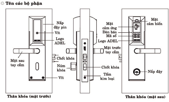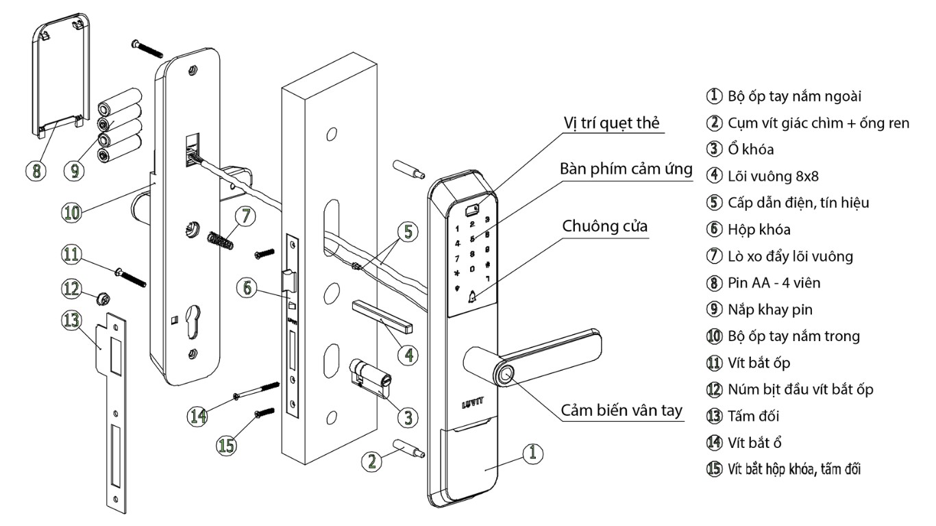 Phần thân khóa làm từ hợp kim nhôm kẽm, bao gồm mặt trước (cảm biến vân tay, bàn phím, khe thẻ, tay cầm) và mặt sau (nắp pin, chốt khóa trong), đảm bảo độ bền cao và vận hành ổn định. Sự kết hợp giữa kiểm soát vật lý và điện tử giúp khóa cửa điện tử vừa an toàn, vừa tiện lợi, phù hợp với nhu cầu của các gia đình hiện đại.