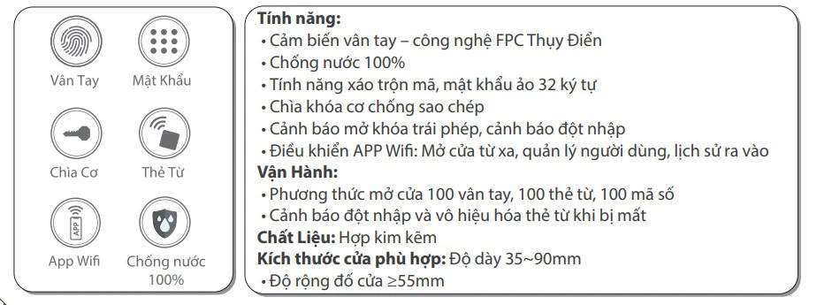 - Tiện nghi tối đa: Mở bằng vân tay, mã số, thẻ từ, App điện thoại hoặc remote.