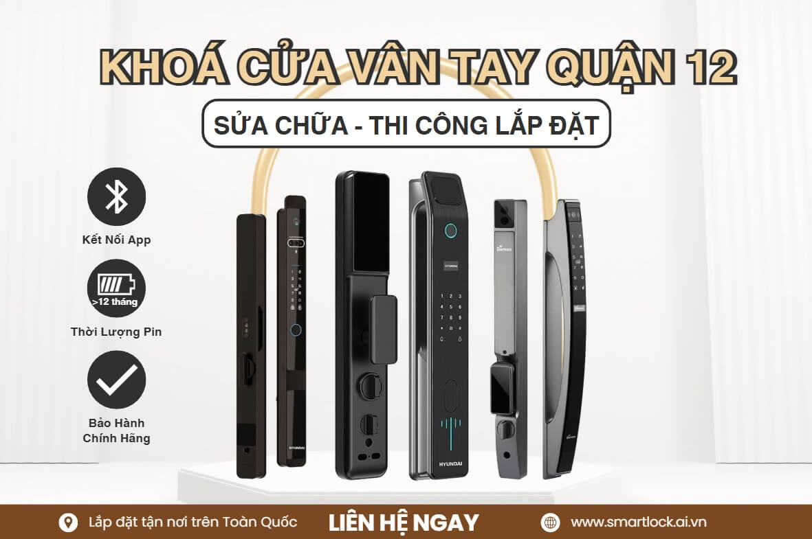 Smart Lock là đơn vị chuyên cung cấp dịch vụ sửa chữa khóa cửa điện tử tại Quận 12 với quy trình kiểm tra và xử lý theo tiêu chuẩn kỹ thuật. Các lỗi thường gặp như không nhận vân tay, loạn cảm ứng, lỗi kết nối app, khóa không tự động đóng hoặc hết pin đột ngột đều được kiểm tra chi tiết từ bo mạch, cảm biến đến hệ cơ khí bên trong. Đội ngũ kỹ thuật có kinh nghiệm giúp xác định đúng nguyên nhân, từ đó đưa ra phương án sửa chữa hoặc thay thế linh kiện chính xác, đảm bảo khóa hoạt động ổn định trở lại.